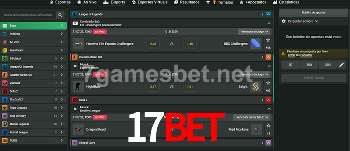 O 17bet oferece uma grande seleção de opções de apostas em e-sports com probabilidades competitivas